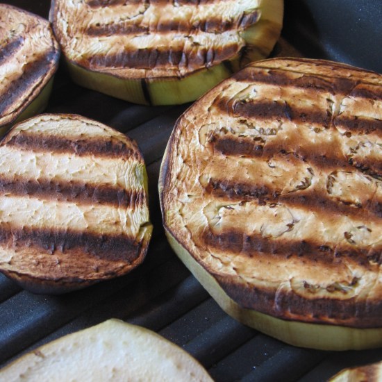 Brush grill or grill pan with olive oil. In batches, grill eggplant and zucchini slices. Set aside.