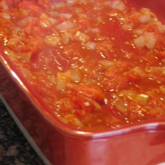 In medium saucepan, add a tablespoon of olive oil. Add onions and cook until soft and translucent, stirring occasionally. Add garlic and cook for 1 minute. Add tomatoes and their juices. Bring to a simmer and let simmer for 15 minutes. Season to taste with salt and pepper.