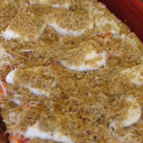 In a large casserole dish, spread 1/4 cup of sauce in the bottom of the dish. Cover sauce with four lasagna noodles. Spread half of the ricotta mixture over the noodles. Add enough sauce to cover the ricotta. Add a layer of grilled eggplant slices. Sprinkle with sauce. Make a layer using the zucchini slices and sprinkle with sauce. Make a layer using the remaining grilled eggplant slices. Sprinkle with sauce. Cover with remaining four noodles and spread with remaining ricotta mixture. Cover with remaining sauce. Sprinkle with 1 cup Parmesan cheese and add the mozzarella slices. If desired, sprinkle with bread crumbs.