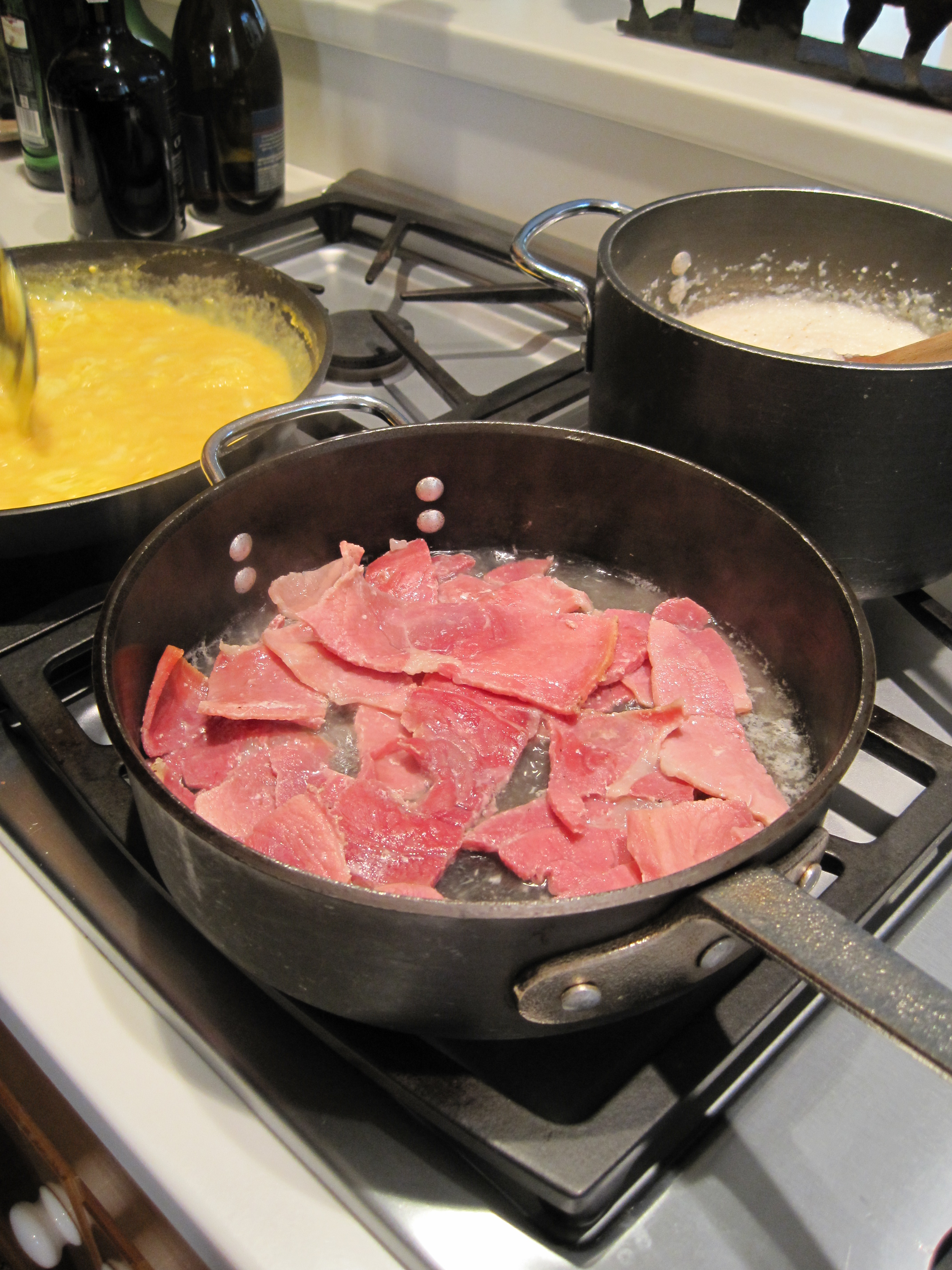 While my mom contributes the Moravian sugarcake, my dad is the chef when it comes to Christmas breakfast. He has been the breakfast man in our family for years and growing up, it was always a treat to see what Dad had whipped up for us that morning. We always had waffles on Saturday, apple pancakes at least one day a week, and his grits with corned beef over toast is still one of my favorite things to wake up to in the morning. My father prepared breakfasts for his family growing up and the country ham he prepares on Christmas morning has been a part of his Christmas morning routine for years now. While some people fry the country ham in grease before making the gravy, my father cooks his in water . It’s a technique that leaves the ham moist and slightly more healthy.
