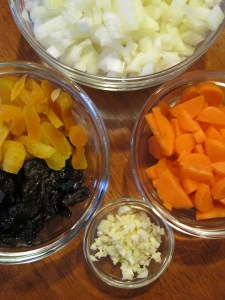 Add the onions and carrots to the oil and sauté until just soft, about five minutes.  Stir in the garlic, cumin, coriander, and cinnamon.  Cook just until fragrant, about 30 seconds, then add in the flour.  Stirring constantly, cook the flour for 1 minute before slowly stirring in the broth.  Be sure to scrape the bottom of the pot when you are adding the stock.  Add the tomatoes with their juices, the prunes, and the apricots to the pot. Stir in the browned meat with any juices. Bring to a simmer.