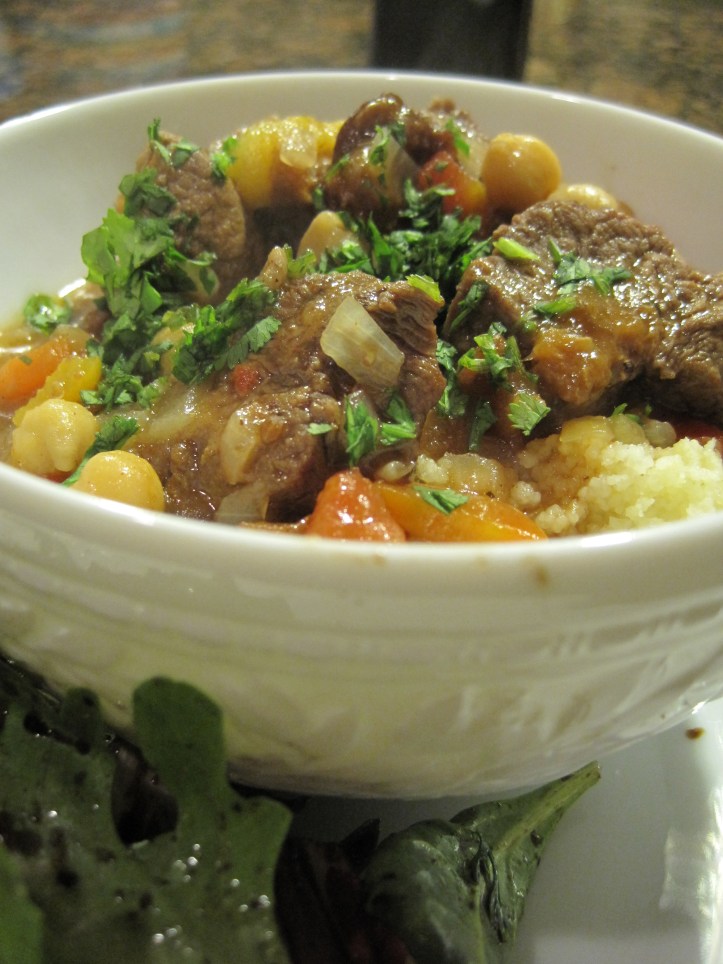 I serve this hearty stew over couscous with a light salad of mixed greens.  A glass of red wine, while optional, makes the meal that much better.  For those who look with disgust on the dried prunes in the ingredient list, give them a try.  The dried fruit melts into the sauce and adds a touch of sweetness that is delightful with the savory elements of the stew.