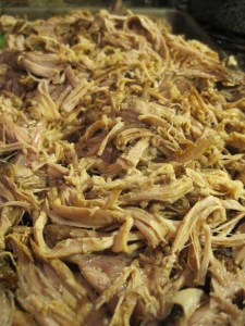 My mother first introduced me to slow cooker pulled pork.  She has a fabulous recipe that takes advantage of pungent onions and vinegar to make a BBQ in that Eastern Carolina tradition.  It’s delicious and has been my standby recipe for pulled pork for years now.  But on a recent run, I was listening to a podcast of public radio’s The Splendid Table and learned about slow cooker pulled pork with liquid smoke.