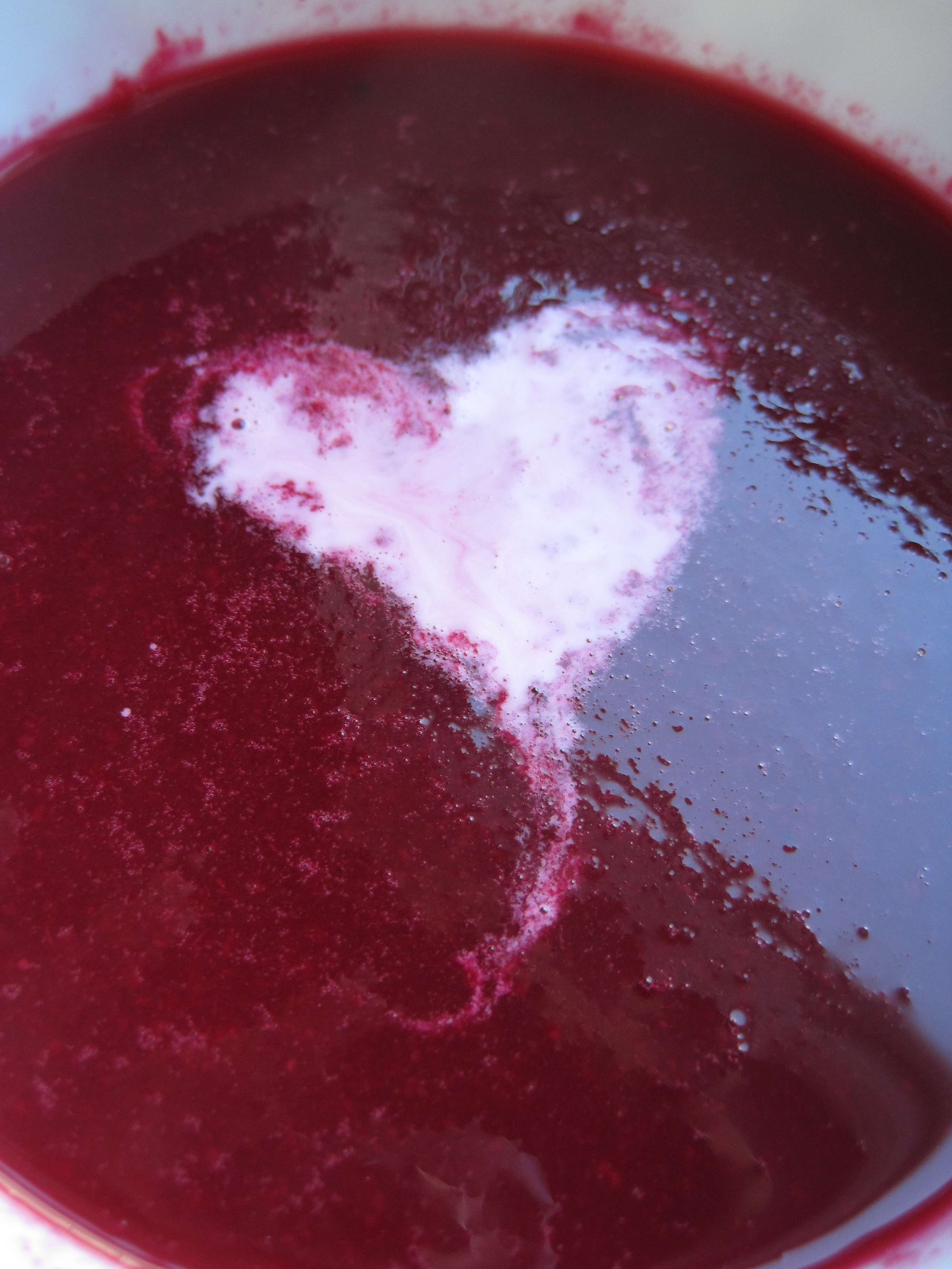 The recipe sounded good, but I figured I could make it even better by blending the vegetables with the broth to form a purée. This, I reasoned, would make a soup that was thick enough to garnish with a cream heart. I want to apologize now for what was a horrible idea. If you choose to make this soup, harness your inner tacky and don’t purée the vegetables with the broth. Yes, blending the vegetables does make it possible to make a heart out of cream in your soup. I have a picture to prove it. But blending the soup does not make it silky smooth. Rather, it makes the soup grainy which is not only unpleasant to look at, but is also unpleasant to eat. Sure the heart is cute, but the soup is…well…not.