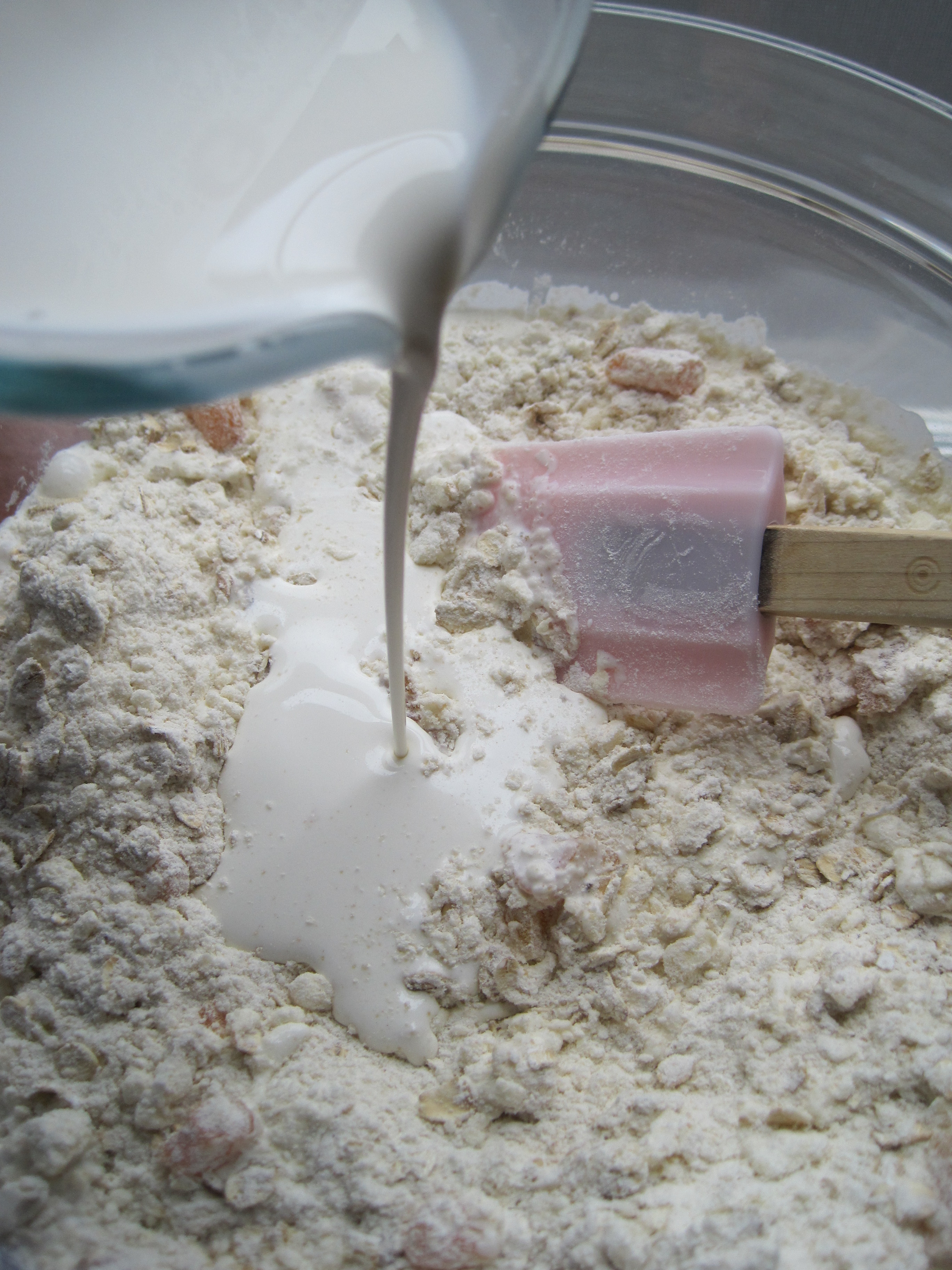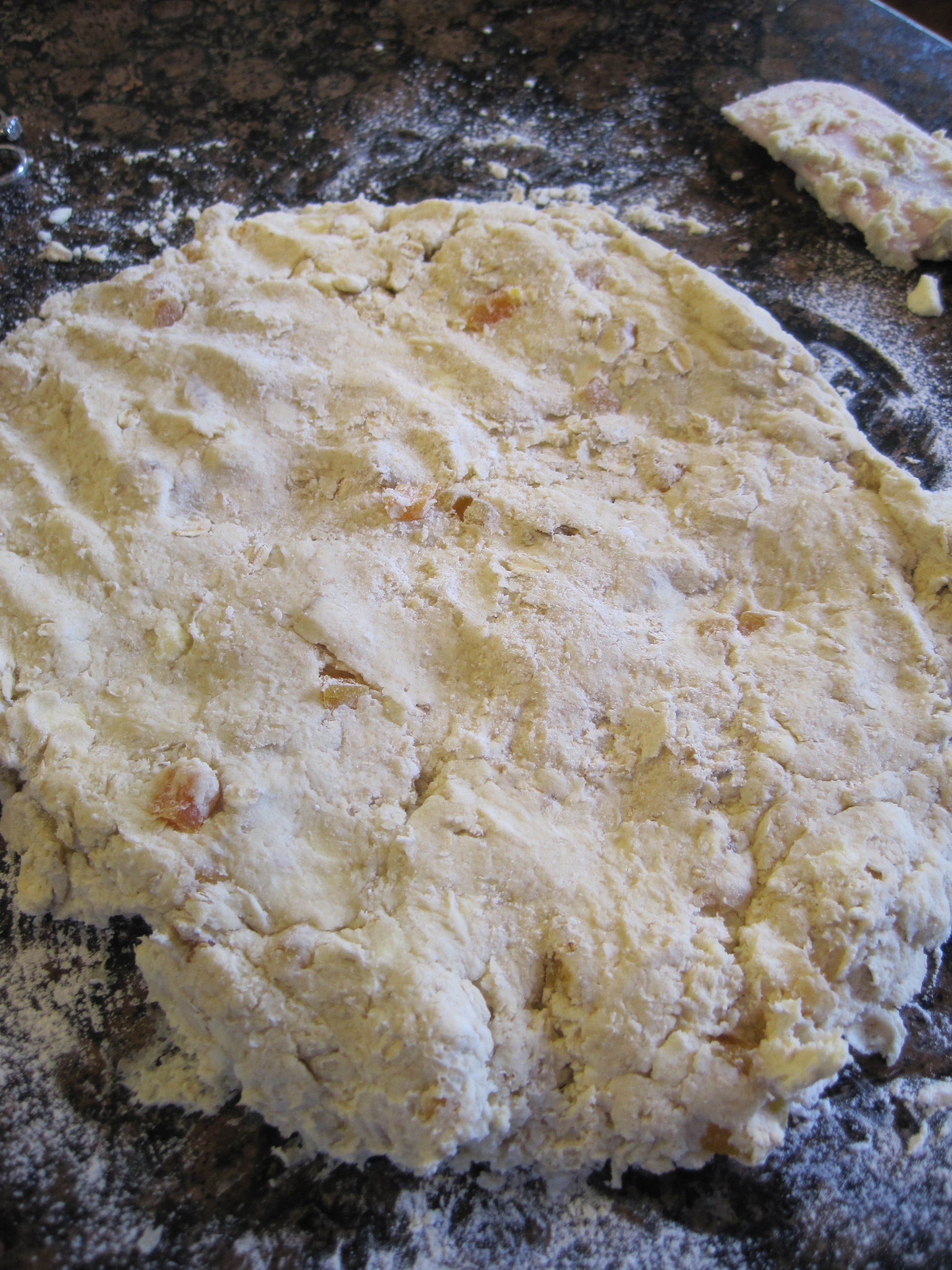 Stir in 1 cup oats and the dried apricots. Slowly add the heavy cream and vanilla extract and stir to combine. When the mixture starts to come together, turn it out on a well-floured counter and pat it into a large square that is about 1-inch thick. Use a knife to cut the dough into the desired number of triangles and use a thin metal spatula to transfer each dough triangle to the parchment-lined baking sheets.