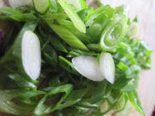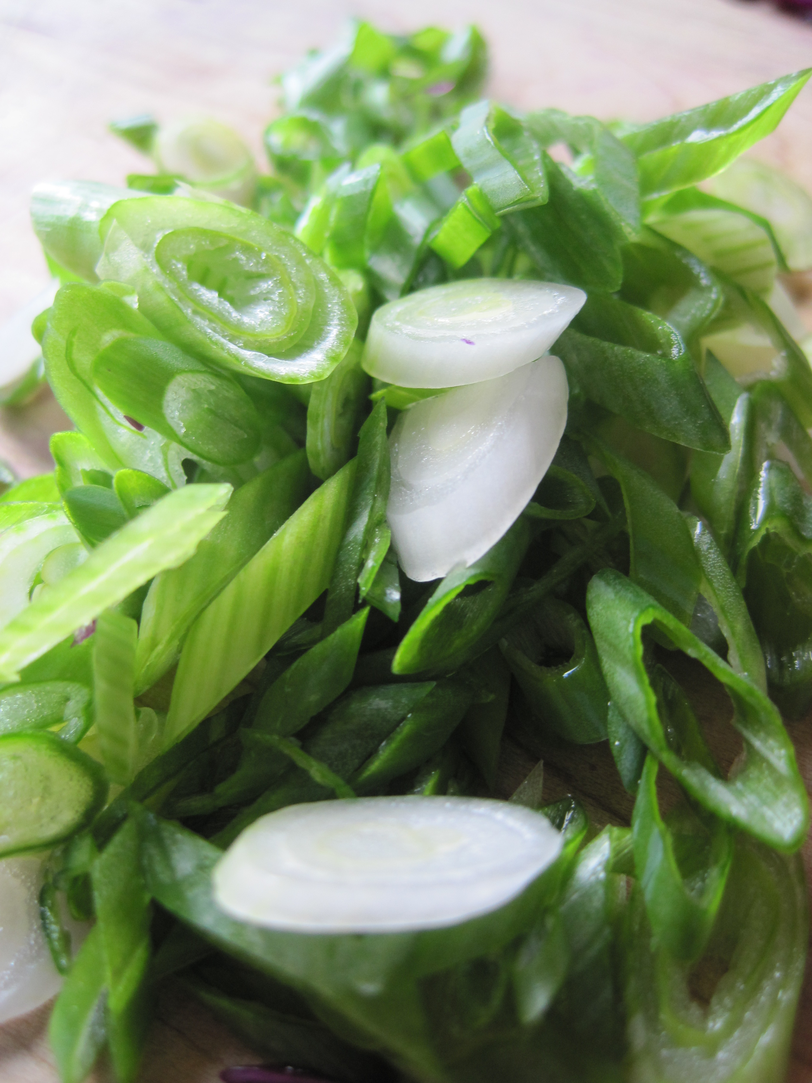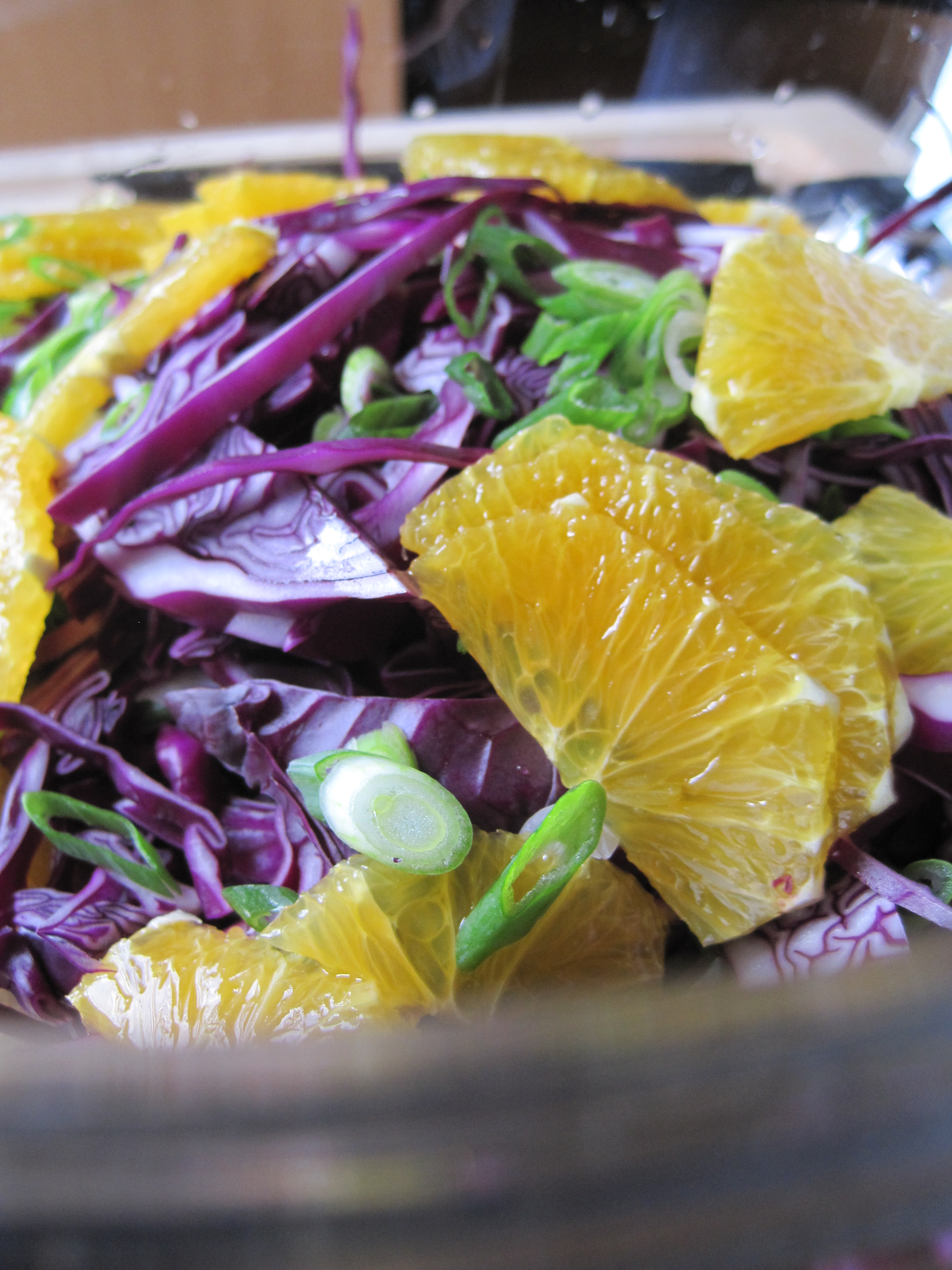 Combine the red cabbage, orange slices, and green onions in a large bowl.  Toss to combine.