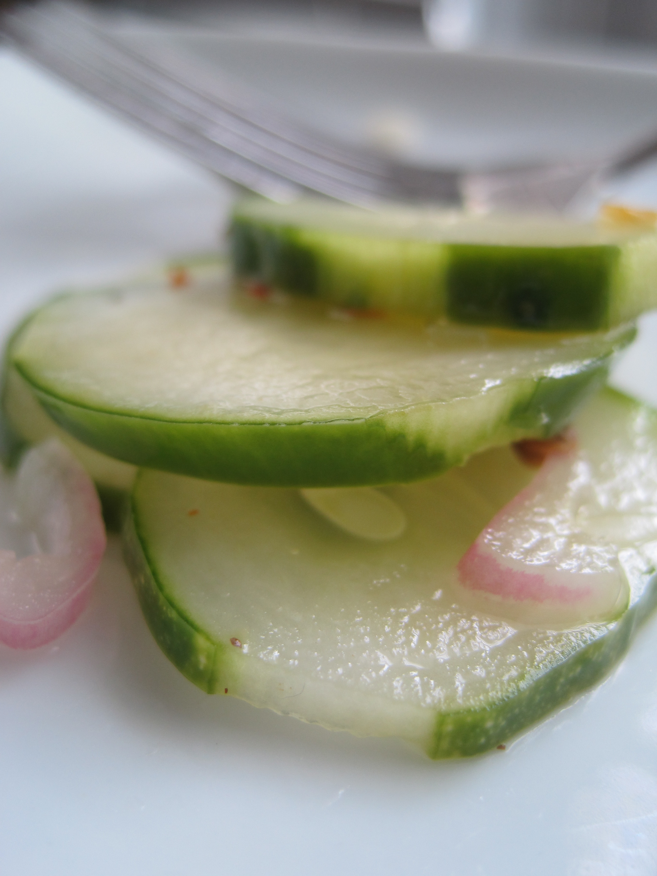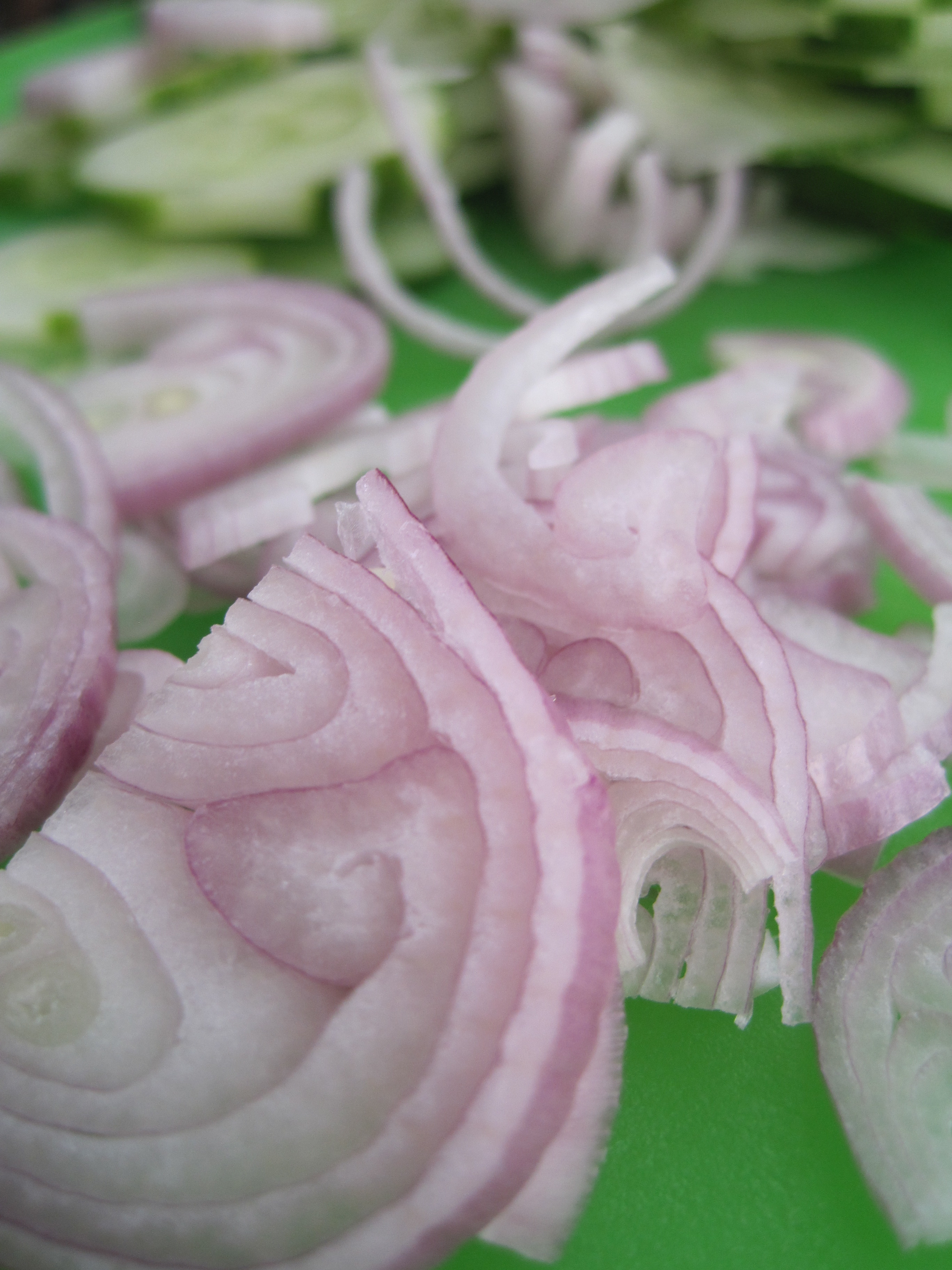 Peel the cucumbers in stripes and cut into ¼-inch thick rounds. Toss the cucumber slices with the sliced shallot in a small bowl and set aside.