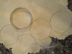 On a floured surface, roll out one disk of dough to 1/8-inch thickness. Cut out 15 circles using a 3-inch round cutter. Repeat with the other disk of dough.