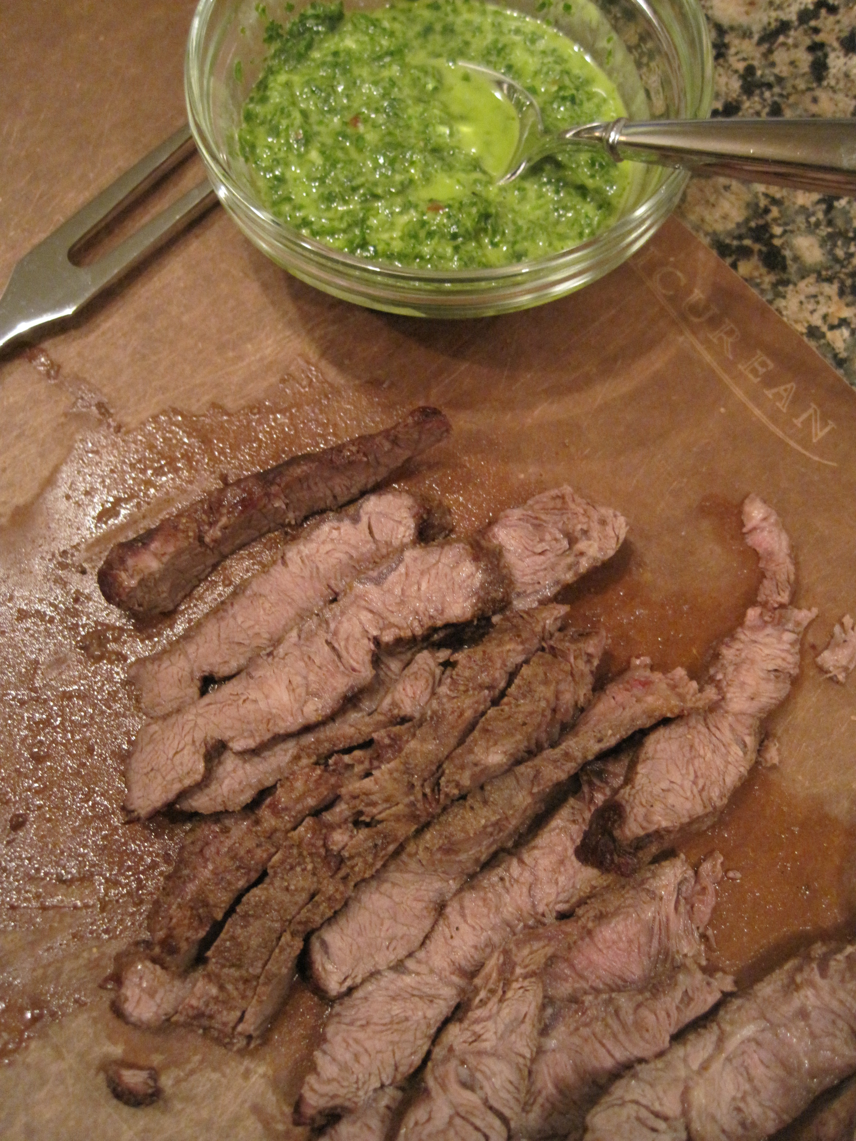 Thinly slice the flank steak against the grain. Serve with the chimichurri sauce.