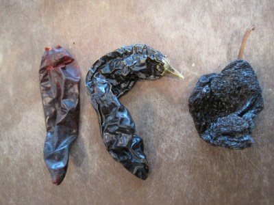 Dried Chilies (L to R): Guajillo, Pasilla, and Ancho