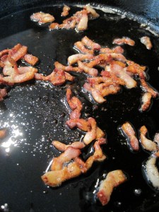 Render (melt the fat over low heat) the bacon in a large skillet until the bacon is crispy. Remove the bacon using a slotted spoon and set aside. Discard all but a thin film of bacon grease and add the onions. Cook on medium heat until the onions soften and begin to brown. The longer you cook the onions the better they will taste. Remove the onions using a slotted spoon and, if needed, add a teaspoon or less of the reserved bacon grease or olive oil to the pan. Add the kale and sauté until just soft. Remove the kale using a slotted spoon and set aside.