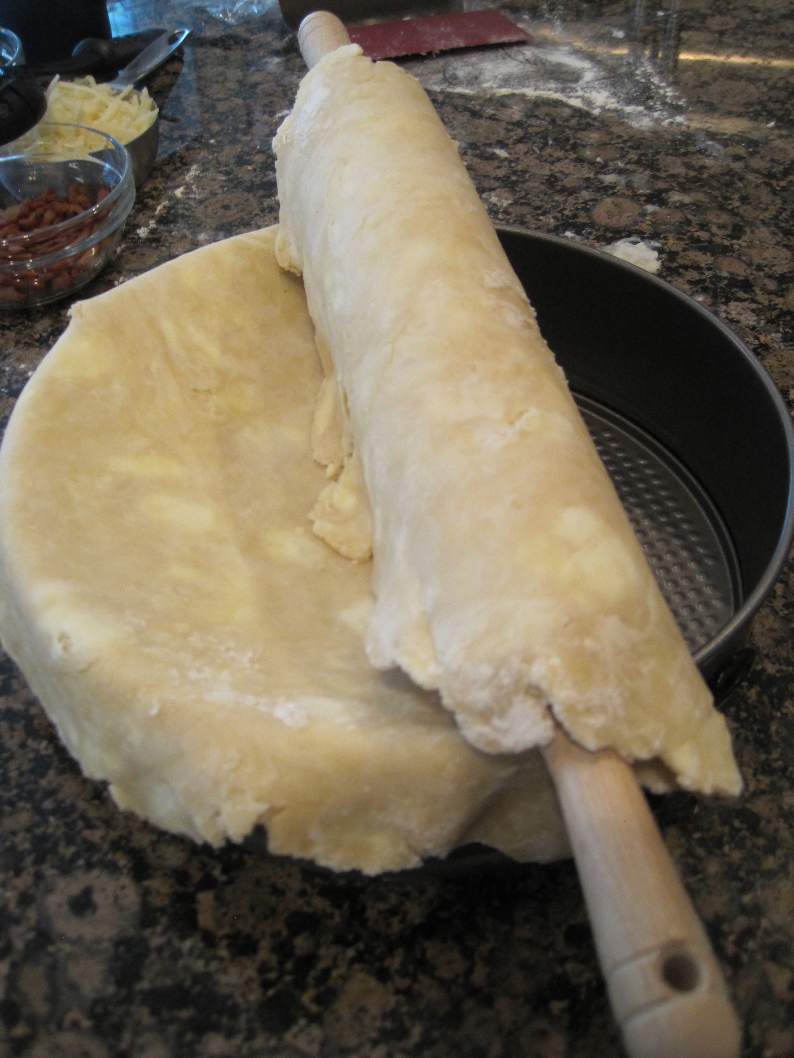 I find that one of the most common mistakes in making pie dough comes when you are rolling out the dough. This is the fun part and I find that most of us tend to get a little excited. We start rolling out the dough and before long we have a pizza-sized circle sitting in front of us. Things are looking good until we go to lift the dough to transfer it to the pan and find it stuck to the counter. Been there? The easiest way to avoid this problem is to brush the dough with flour as you roll it out. After every couple of rolls, brush the dough with flour and then place your rolling-pin in the center of the dough. Fold the dough over the rolling-pin and then use the rolling-pin to help you flip it over (see the pictures if you are a visual learner). Brush with flour again and repeat until you’ve rolled out the dough to the proper shape. I typically will flip my dough 3 to 5 times while I’m rolling it out. Once you are ready to move your dough to the springform pan or pie plate, don’t try to pick it up. Again, enthusiasm gets the best of us here. Gently fold the dough over the rolling-pin and move it carefully to the pan. Roll the dough over the pan and then trim it as needed. Easy enough, right?