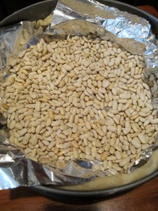 This recipe requires that you blind bake the crust. On a side note, “Introduction to Baking and Pastry” was my first class in culinary school and I had nightmares about blind baking. I thought it was a test where we had to bake something without looking at it. I have a vivid imagination and fortunately, it is not as threatening as it sounds. Blind baking simply refers to pre-baking the crust before you add the filling. Pie doughs have a tendency to develop air bubbles when baking so to prevent that from happening, you’ll want to lay a sheet of aluminum foil over the dough and then weigh it down with either pie weights or dried beans (if you got a little over-ambitious and bought several pounds of white beans for last week’s recipe, this might be a good use for some of them). After you’ve weighted down the crust, simply put the pan in the oven for 20 minutes to bake. Remove the pan from the oven and carefully remove the foil and the weights or beans and then return the crust to the oven for another 10 minutes. Ta-da – you’ve successfully blind baked your crust. That wasn’t so hard, was it?