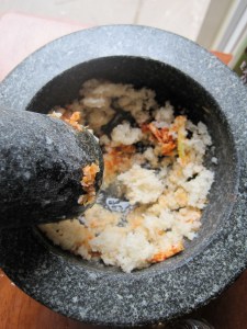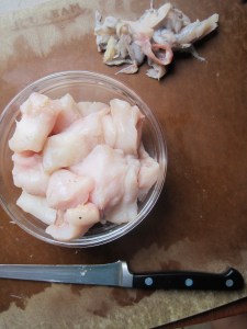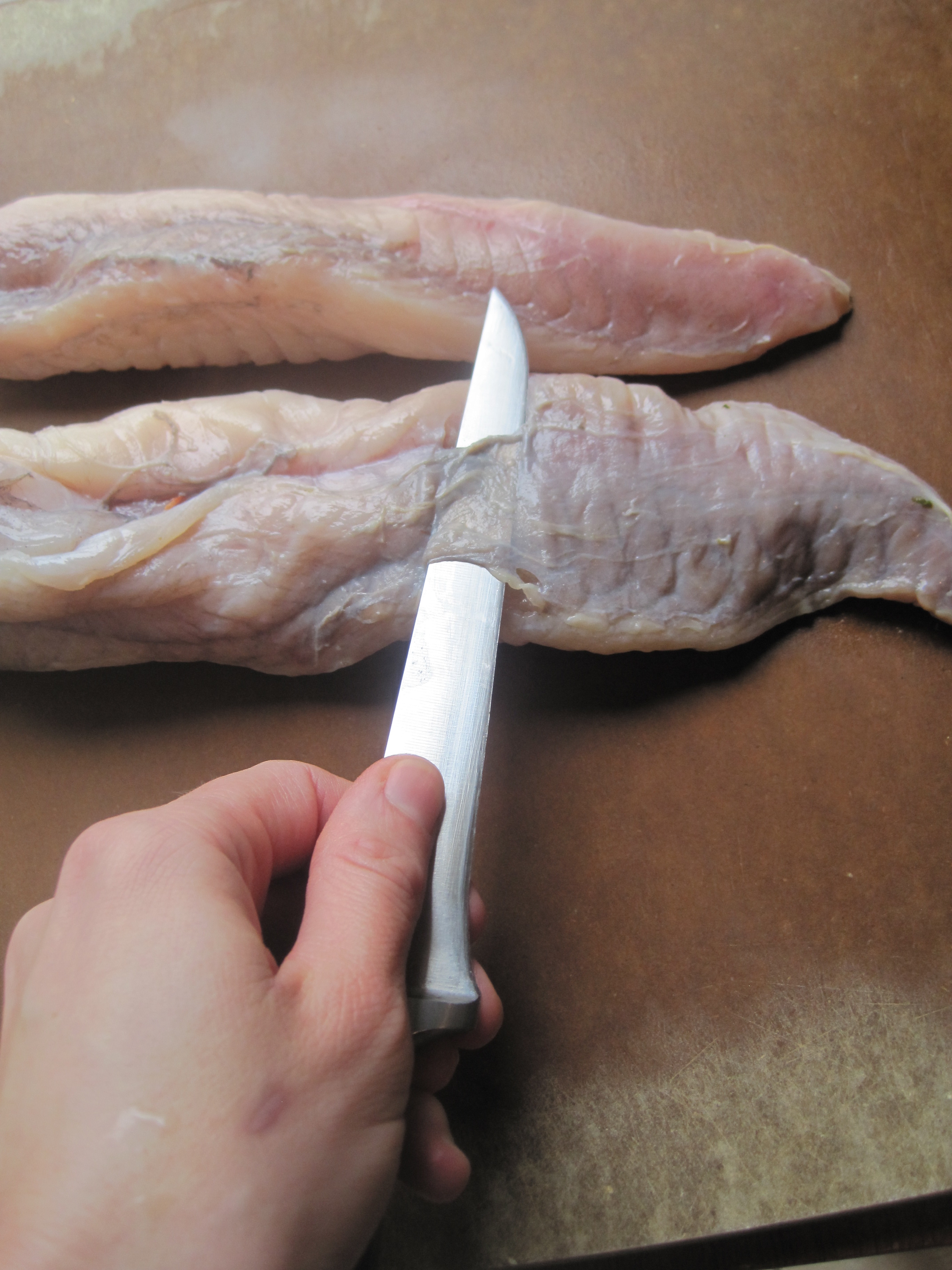 Quality is important here so seek out the best seafood you can find. While traditionally bouillabaisse is a fish stew, any type of shellfish is a wonderful addition and will not elicit complaints from guests. The rouille on top is also a must. It’s a humble sauce of bread crumbs, garlic, cayenne, and olive oil, but it does big things in the bowl. Don’t omit it. And finally, if using monkfish in your stew, be sure to take off the gray membrane with a fillet knife (see pictures below). If the membrane is left on, the monkfish will become tough as it cooks. Happy cooking!
