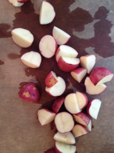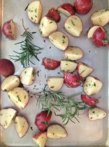 Preheat the oven to 400 degrees. In a small bowl, toss the quartered potatoes with the ½ tablespoon olive oil, minced rosemary, salt, and freshly ground black pepper. Spread the potatoes on a baking sheet and bake for 25 minutes or until tender and browned, turning the potatoes after 15 minutes. Remove the potatoes from the oven and let cool.