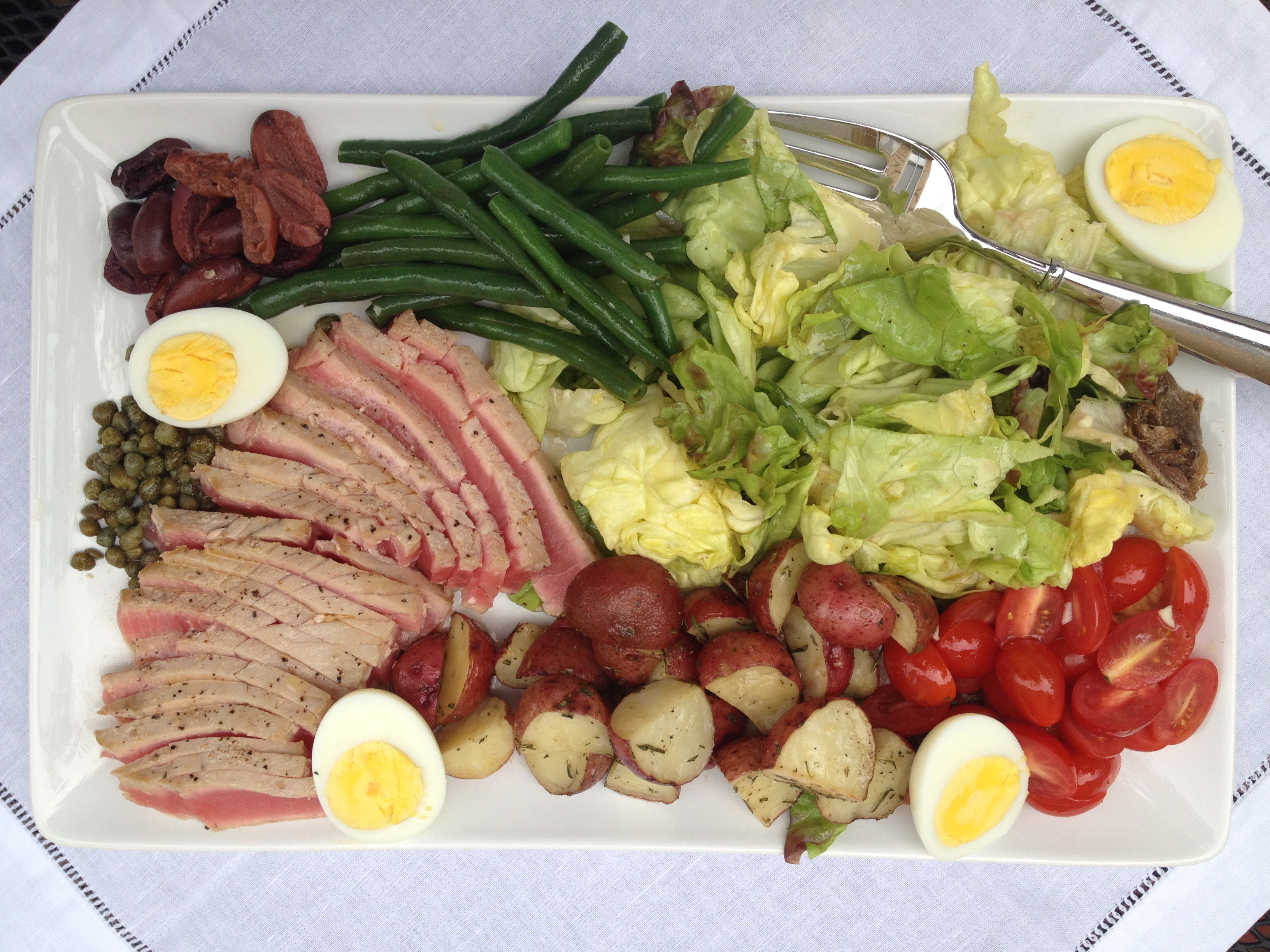 *Variation if using canned tuna: Dress the potatoes as instructed above. In a large bowl, combine the haricot verts, halved grape tomatoes, olives, and capers. Use 1 tablespoon of the vinaigrette to dress these ingredients. Gently toss the tuna chunks in another 1 tablespoon of vinaigrette.