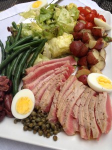 What does that involve? Potatoes are roasted to golden crispness, haricot verts are blanched and shocked to al dente perfection, and tuna is seared to your desired level of doneness. All of the ingredients are tossed, individually, at the last possible minute in a homemade vinaigrette. A serving platter is then assembled so that each diner can make the salad to their tastes.