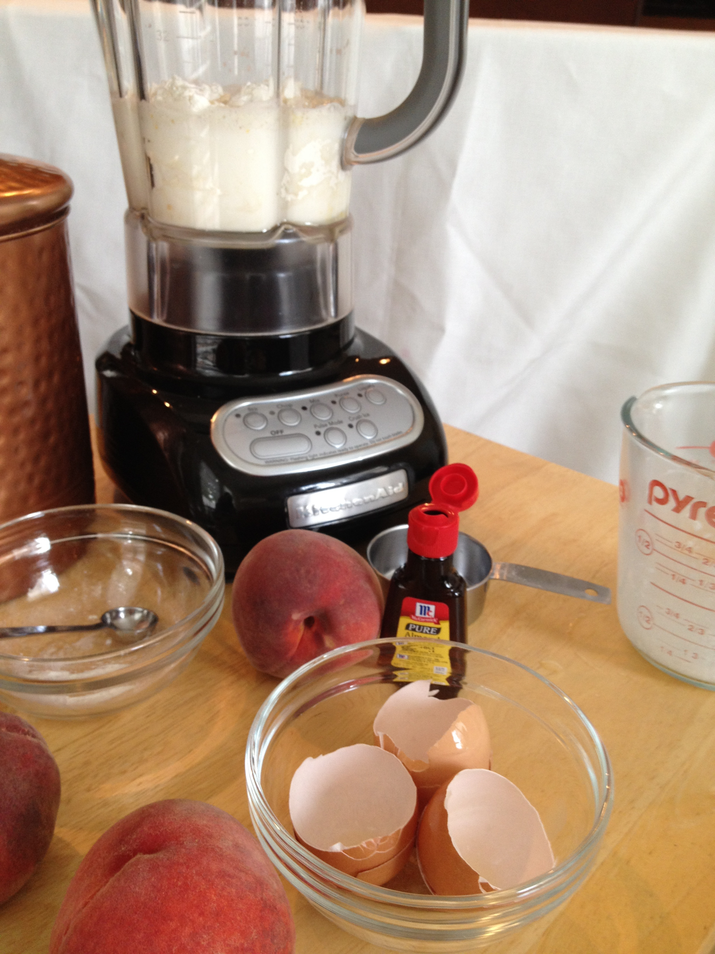 Julia’s cherry clafouti was the first dessert that I made from Mastering the Art of French Cooking. In honor of what would be her 100th birthday (tomorrow – August 15th), I adapted it to feature one of my favorite combinations: peaches and almonds. To Julia, thank you! To you, my readers, bon appetit!