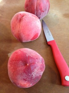 Bring a small saucepan of water to a boil. Cut a small “x” in the blossom end (not the stem end) of each peach with a paring knife. Fill a large bowl with ice and water to make an ice water bath. Add the peaches to the boiling water and cook for about 30 seconds or until the skin around the x loosens and can be peeled back easily. Remove the peaches and place them in the ice water bath.