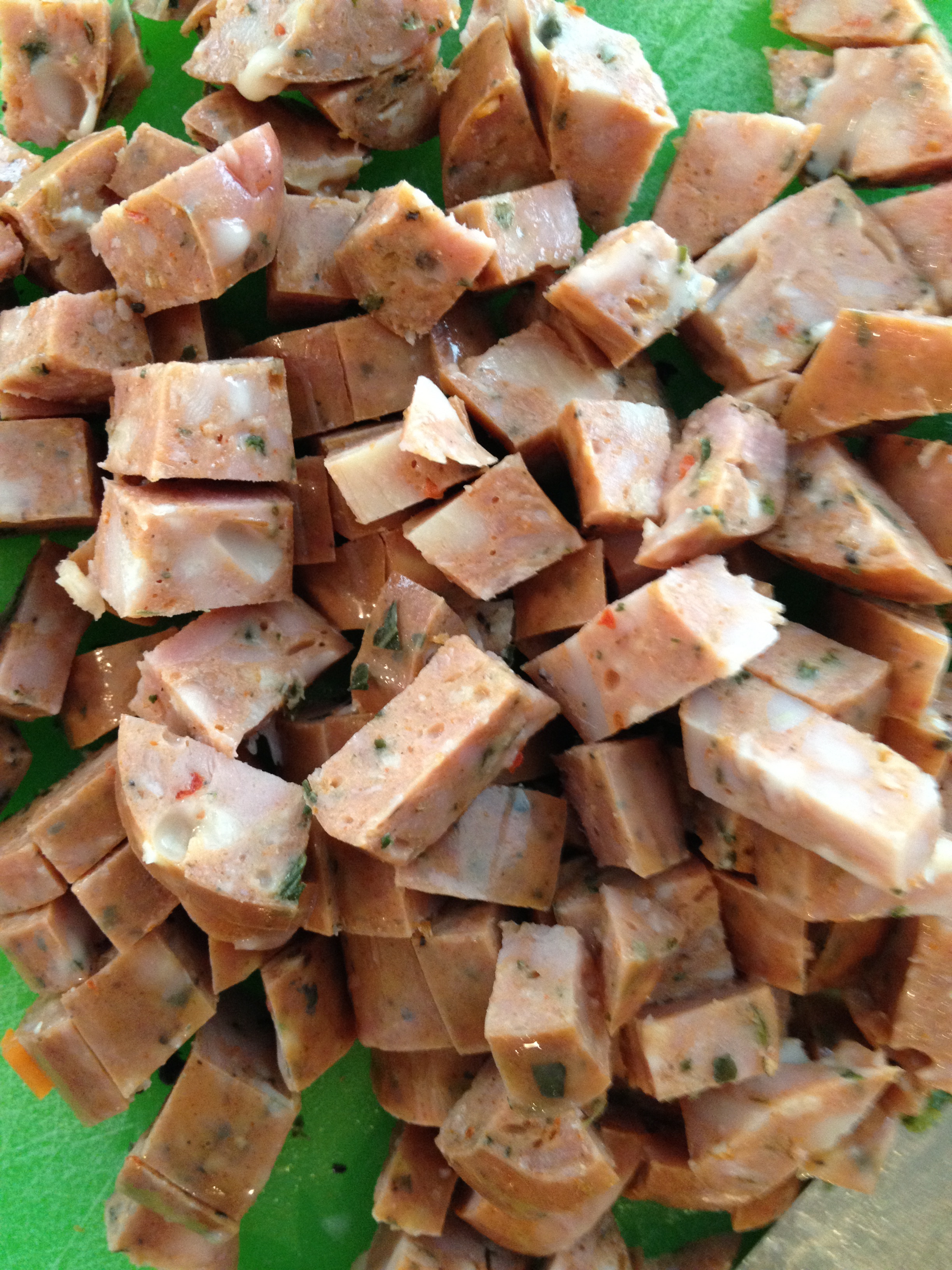Heat one tablespoon of the olive oil in a medium saucepan over medium heat. Add the chopped sausage and cook, stirring often, until golden brown. Remove the sausage from the saucepan using a slotted spoon and set aside.