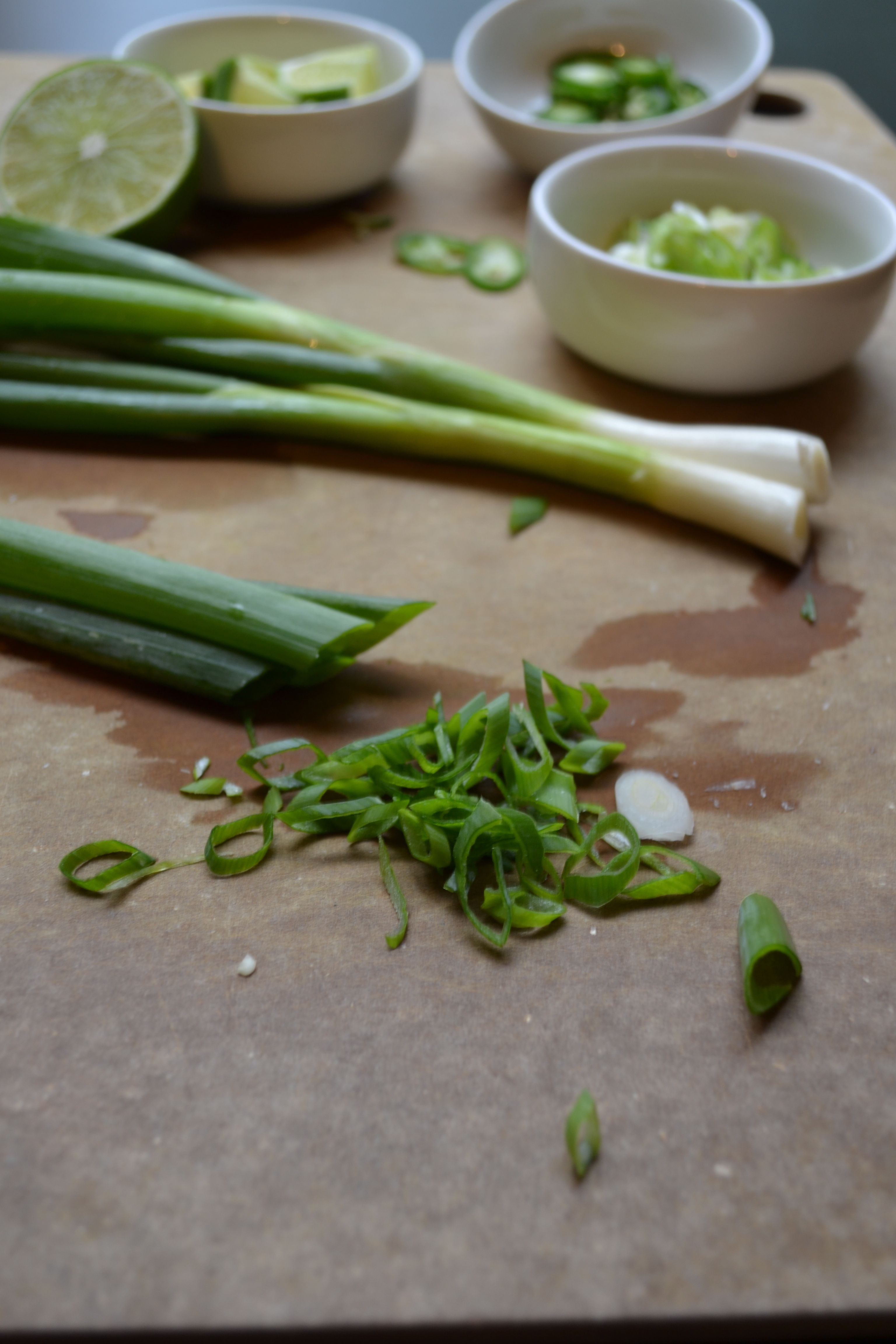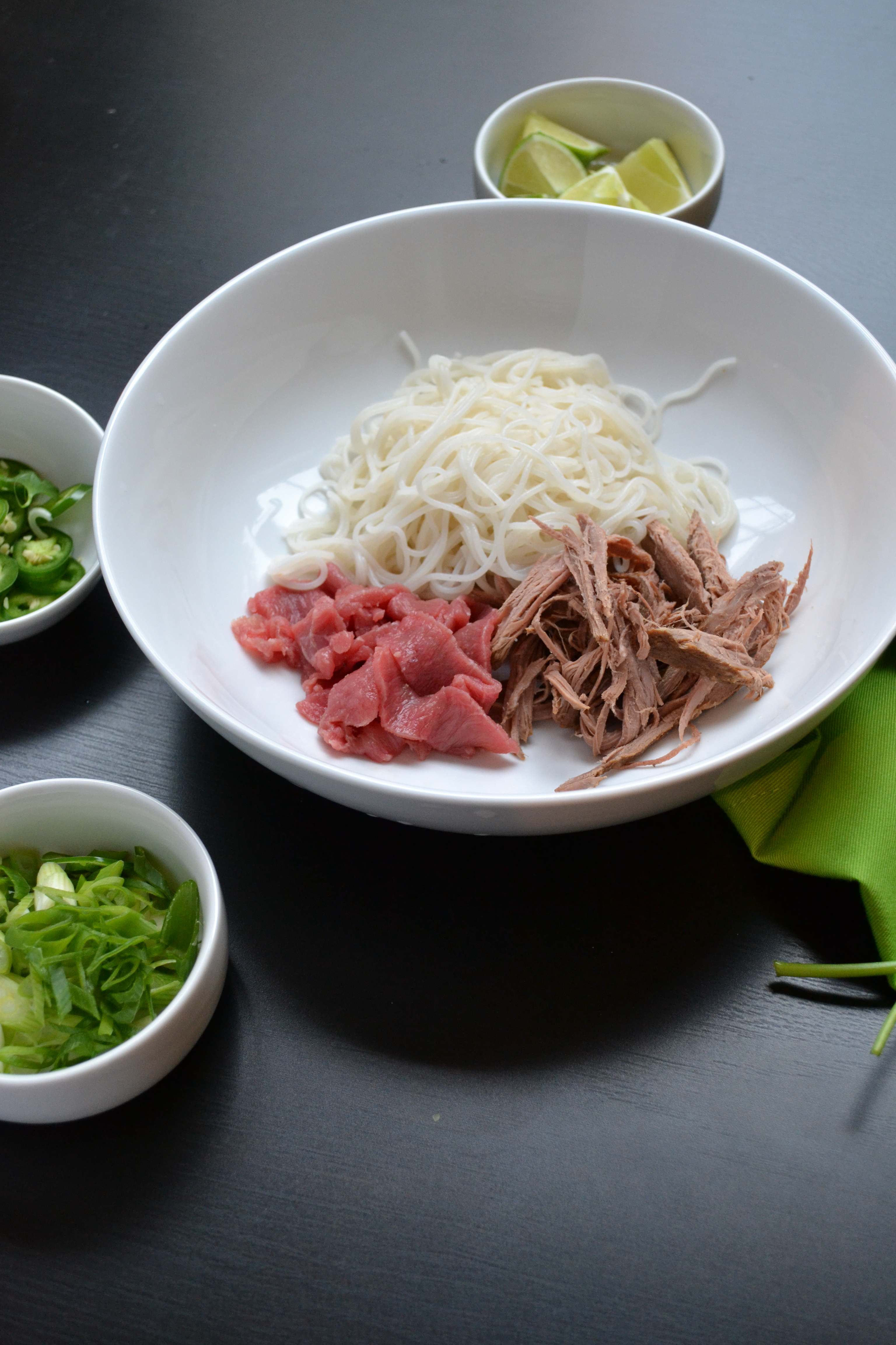 While I did not use them in this recipe, mung bean sprouts, fresh mint, and fresh Thai basil all make delicious toppings. Each of these ingredients should be offered to guests at the table to be added according to personal preference.