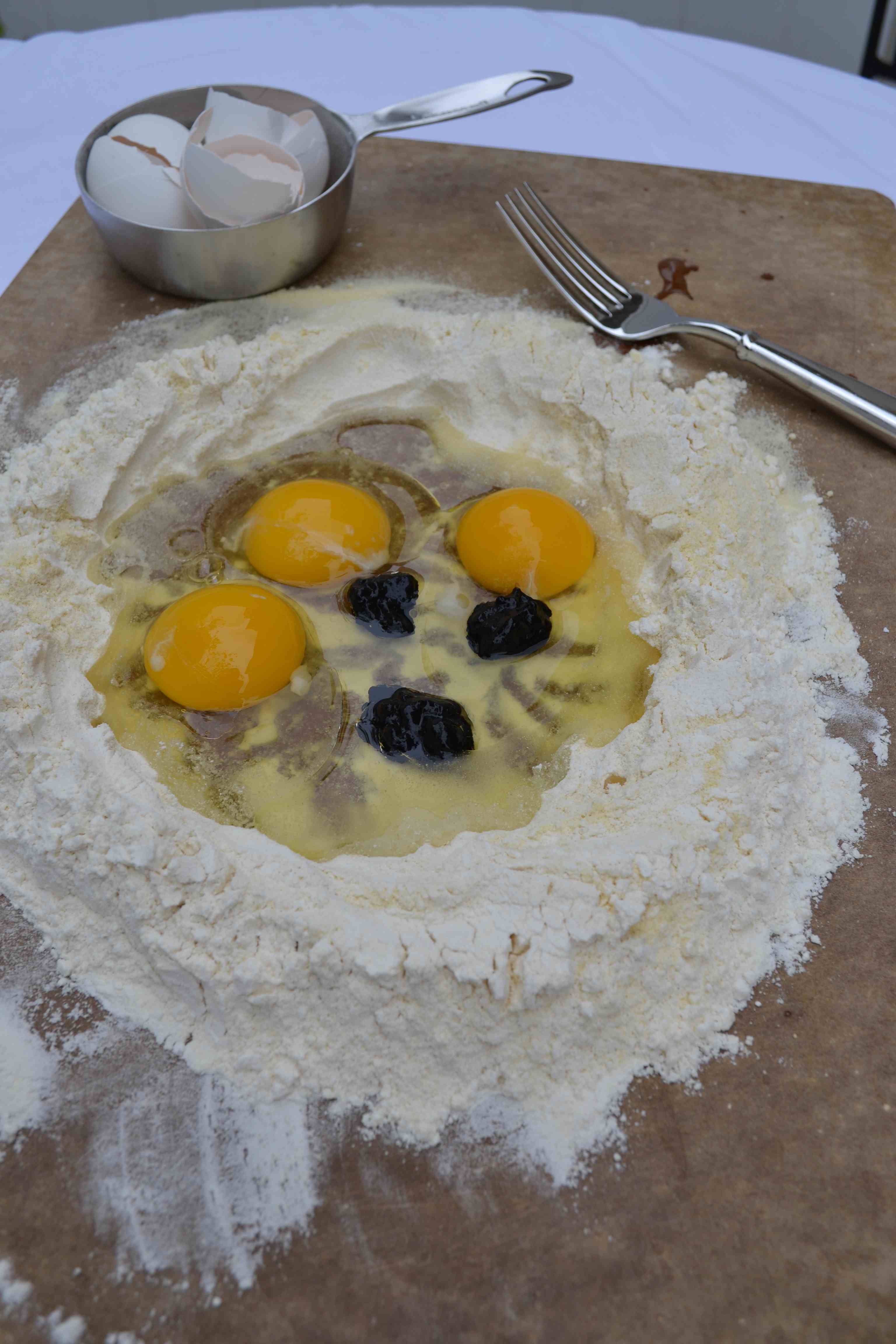 To make the pasta, combine the all purpose flour, the semolina flour, and the salt on a clean countertop. Create a large well in the center of the flour and crack the eggs into the well. Add the olive oil and squid ink and then use a fork to incorporate the eggs into the flour until a lumpy dough forms. Using your hands, knead the dough, adding more all purpose flour or water if needed, until the dough is smooth and elastic. This will take about 8 minutes. Wrap the dough in plastic wrap and let it rest in the refrigerator for at least 15 minutes. Bring a large pot of generously salted water to boil.