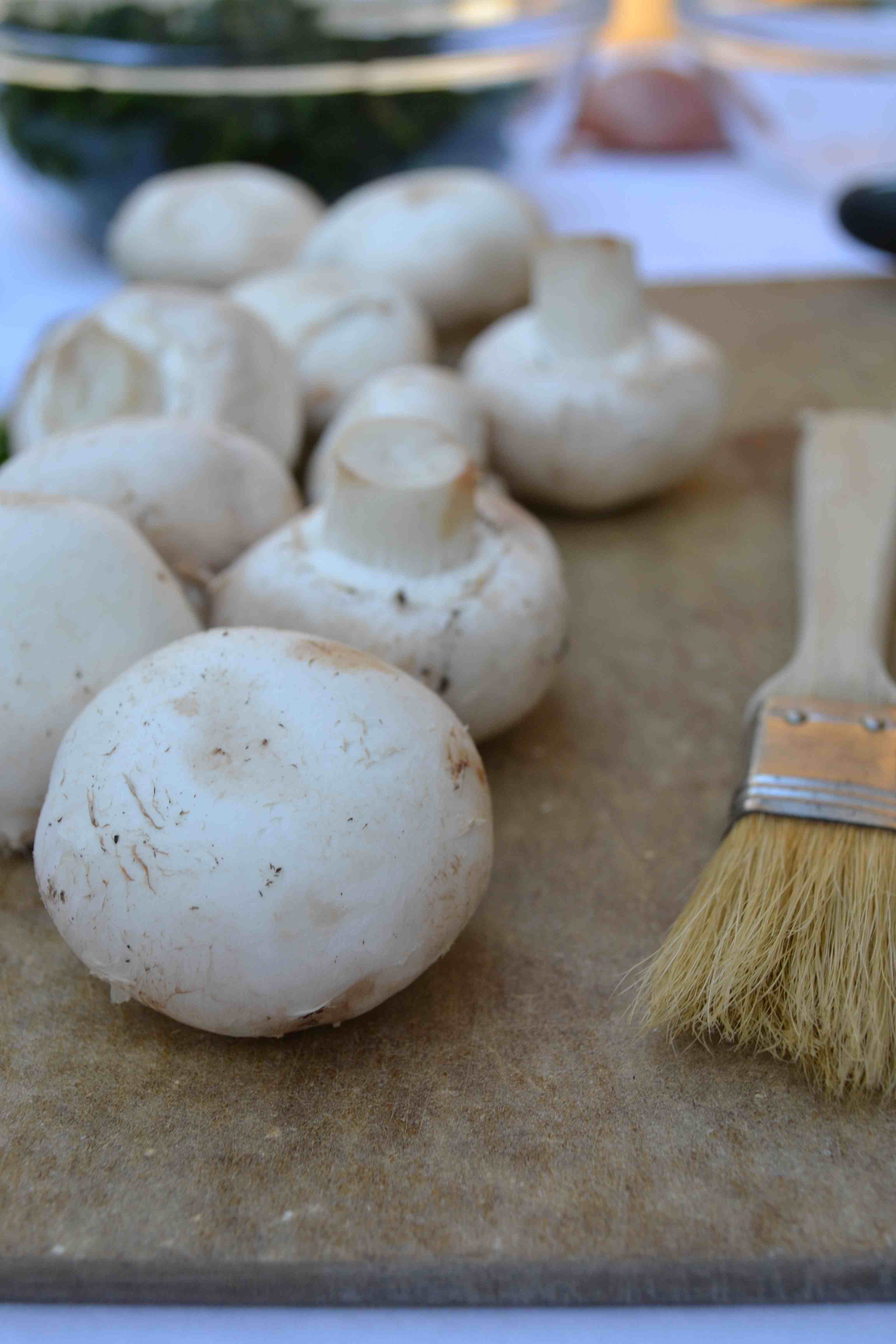 Preheat the oven to 400 degrees and line a baking sheet with parchment paper. Clean the mushrooms by washing them briefly under water, brushing them with a pastry brush, or wiping them with a slightly damp paper towel. Carefully remove the stems.