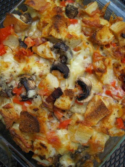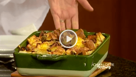 Take this breakfast casserole that I demonstrated how to make on the Charlotte Today show this morning. It won’t be part of your Thanksgiving spread, but when everyone realizes they forgot to plan breakfast there will be plenty of thanks when you pull this out of the oven. I love this savory version with mushrooms, bacon, tomatoes, and onions, but you can just as easily make it a French Toast casserole with a little sugar and cinnamon.