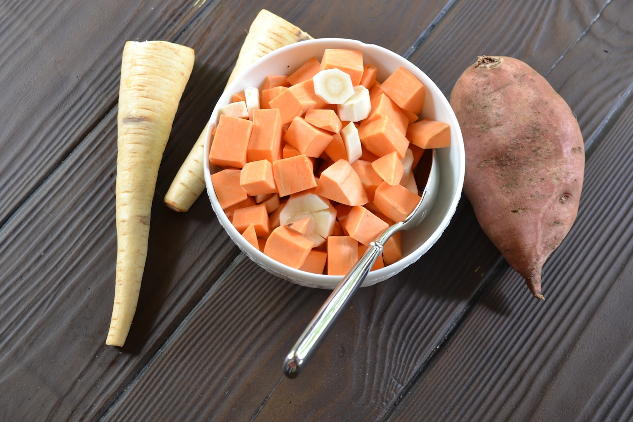 Add water to a large pot and bring it to a boil. Peel the sweet potatoes and parsnips and cut them into ½-inch thick pieces. Add the sweet potato and parsnip slices to the boiling water and cook for 12 minutes or until soft.