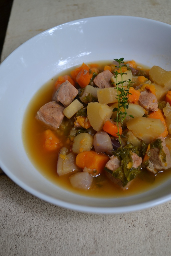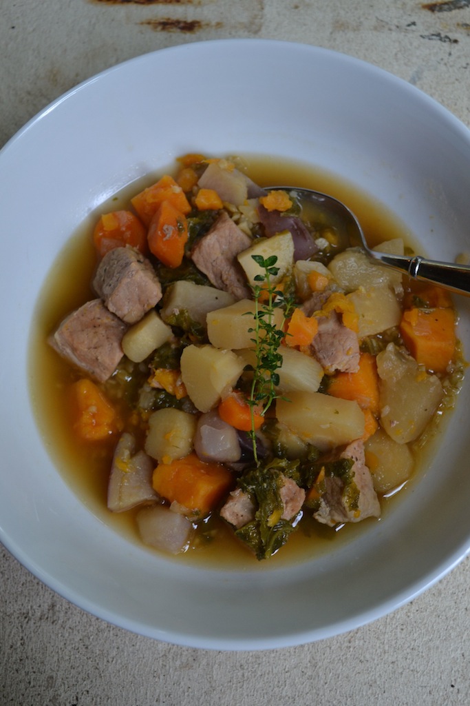 In the interest of simplicity, I added the root vegetables and the browned pork shoulder chunks to the pan at the same time. By the end of the cooking, the vegetables were very tender. If you prefer vegetables with a firmer bite, hold off on adding them until halfway through the cooking process. Happy cooking!