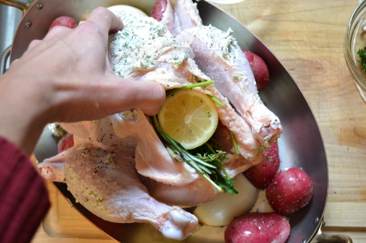 Stuffing the cavity with Salt and Pepper, fresh herbs, and lemon halves