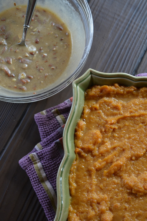 I don’t have a finished picture of this sweet potato casserole as it is partially baked and in my fridge for Thanksgiving. That’s one of the great things about this dish; it can be prepped and partially baked two to three days in advance and then baked off right before serving. Typically I would roast my own sweet potatoes instead of using canned, but my mom swears by Bruce’s canned sweet potatoes (yams) in a light syrup and I have to admit I was game for the shortcut.