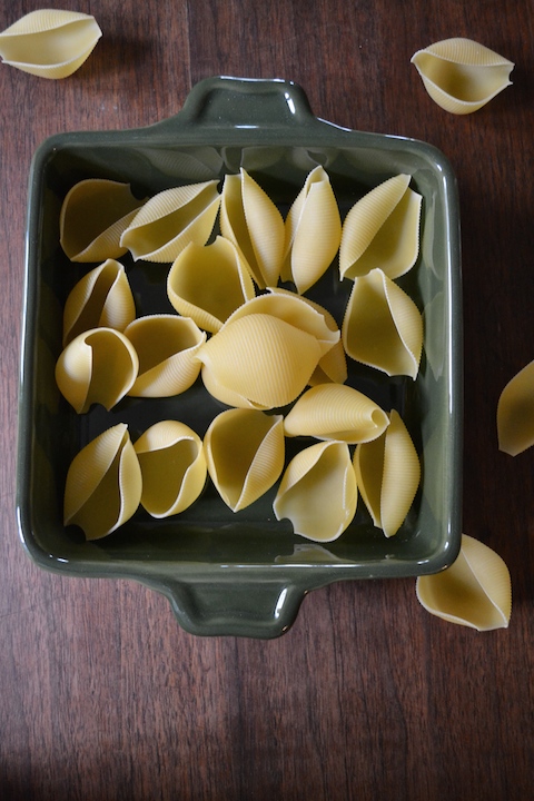 Bring a large pot of generously salted water to a boil. Add the pasta shells and cook for about 9 minutes or until they still retain a bit of a bite. They will cook longer in the oven. Drain and rinse under cold water. Set aside.