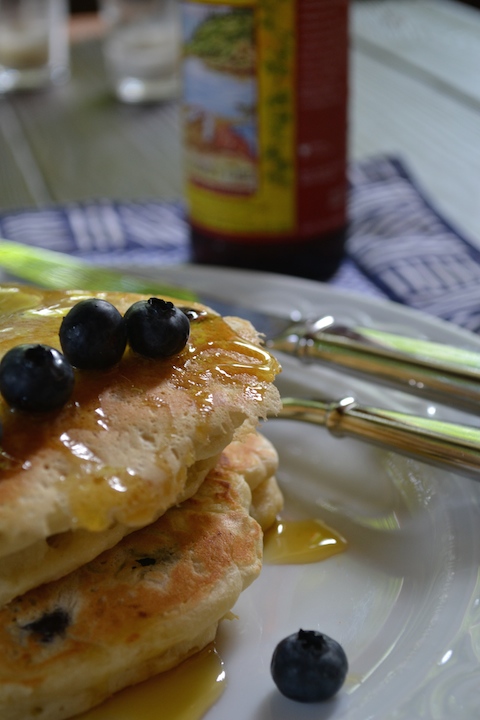 Heat a griddle or large, heavy-bottomed skillet over medium-high heat. Brush the griddle with a little butter and drop about 1/3 cup of batter onto the griddle. Bake until the surface of the pancake is covered with small holes and then turn over with a spatula. Cook until the other side is brown. Serve hot and stacked high with a pat of butter and Lyle’s Golden Syrup (my personal choice) or maple syrup. Eat. Enjoy. Get seconds.