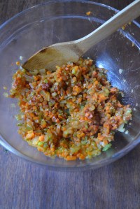 Preheat the oven to 350 degrees. Heat the olive oil in a large skillet over medium-high heat. Add the onion, carrot, celery, ¼ teaspoon salt and 1/8 teaspoon pepper and cook until soft and golden, about 5 to 7 minutes. Stir in the garlic and cook until fragrant, about 30 seconds. Stir in the tomato paste and cook for an additional minute. Remove the skillet from the heat and let the vegetable mixture cool.