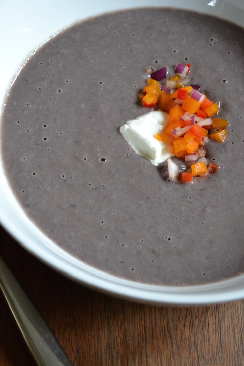 I enjoyed this soup with a dollop of sour cream and a spoonful of the bell pepper and red onion mixture for lunch. For dinner, I added two tablespoons chopped fresh cilantro, a little lime juice, and a drizzle of extra virgin olive oil to the bell pepper and onion mixture for a Latin-inspired twist. Lunch was good, dinner was how this soup is supposed to be served.