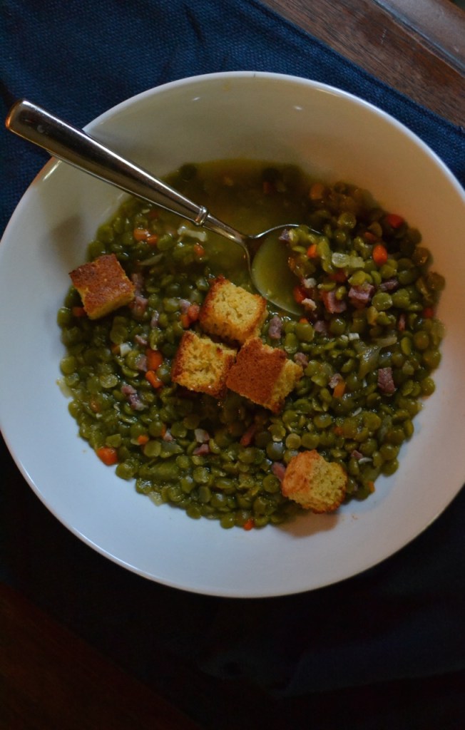 Split Pea Soup with Country Ham and Cornbread Croutons